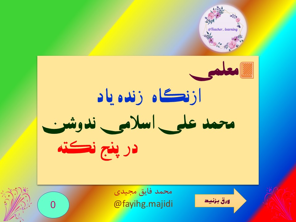 پاور پوینت تجارب شغل معلمی از نگاه زنده یاد محمد علی اسلامی ندوشن در 9 اسلاید نکته اول: روش تدریس من خاص خودم بود . تقریباً ازاد بودم انچه را می نوشتم همان را درس می دادم .پایبند روش خاص وبرنامه خاص و محدودیت خاصی نبودم .به سرکلاس با کتاب نمی رفتم جز گاه گاه که مراجعه به برخی منابع لازم بود. تدریس بدون کتاب وجزوه